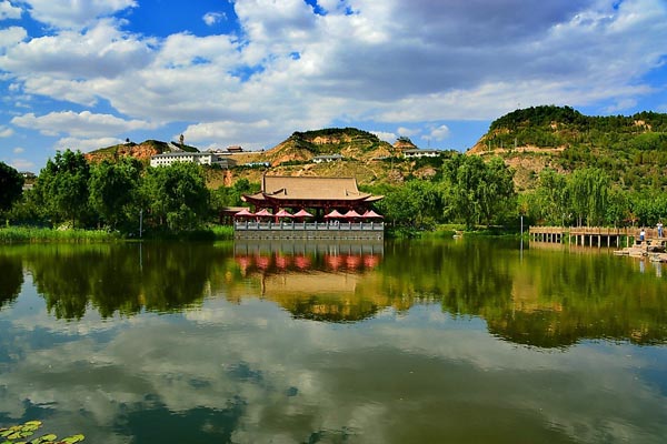 五泉山是兰州市内著名的名胜之地,在唐,宋时代这里就建有寺庙,后毁于兵火。我们能看到的建筑一万多平方米,其中崇庆寺、嘛尼寺、卧佛殿、地藏寺等多系明清时代建筑。古建筑群多集中于中峰。进山门沿中间通道直上,殿宇层叠,楼阁错落,甚为壮观。中峰两侧为东西龙口,幽谷之中清泉吐翠,林荫如盖,廊榭亭阁环绕。东龙口利用山泉之水,新建了碧波荡漾的莲池和逶迤池上的九曲桥,池边伫立二龙戏珠釉壁。