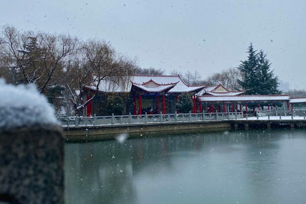 全园分东、中、西三部分,以中部为主。中部湖呈圆形,水面开阔。从湖中伸出数条小水湾,岸线曲折自然,乘船游览,有柳暗花明,源源不尽之意。又用极具民族风格的石拱桥、回廊将水面分成数块,更给人远近高低、回环往复、目不暇给之感。东部首为歇山顶五间宫殿式大门,黄瓦红柱,雕梁画栋,进门即见水池假山。绕过假山,岸上老人垂钓,湖中情侣荡舟,一下豁然开朗。实有“一收一放,欲扬先抑”之效。最西部为歧伯峰,山坡名木遍树,杂花怒放。峰顶竖亭,亭内置凳。