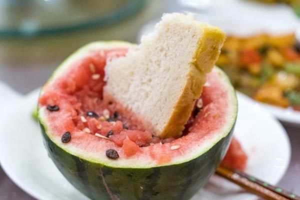 民勤西瓜是无污染的绿色食品,不需任何金属刀具,只在花蒂处,用大姆指甲掐一行印引,挥动巴掌拍打一分为二,将干馒头摁入瓜瓤,食之,清凉爽口,是大漠中特有的美食。