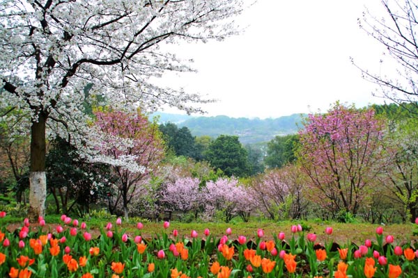 梅园内种植的梅花品种多,有美人梅、垂直梅、游龙梅、红梅、绿梅等品种14类600多株,树形苍劲古朴,面积约46亩。修建有精致的园林小品。园中的朱张渡是历史上“朱张会讲”所留遗址,朱张渡在湖湘文化发展中起着重要的作用。