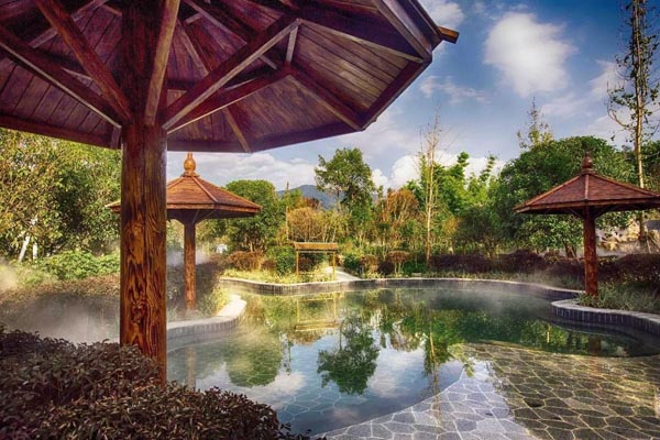 水温40℃至42℃,池边满簇翠竹,倒映池底,让人豁然开朗,心情舒畅;
