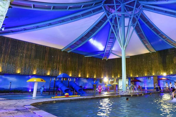 水温36-38度,平均水深0.7米,面积100平方米。山顶室外温泉泊浪池,十二种造浪模式,长期开放,这里您可以体验冲浪、水上运动的活力与刺激,享受夏日的动感无限;让您的每个细胞都跳跃起来。