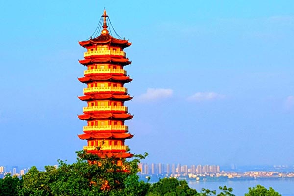 万佛宝塔建在大龟山山顶,亦为镇山之塔。在塔基上,右可俯视南湖美景,七座小龟山浮于水面,时浮时沉,栩栩如生;往左远眺洞庭,来往商旅船只白帆点点;正面鸟瞰巴陵城,整个城市尽收眼底。登塔一望,风景更是绝伦,使人流连忘返。