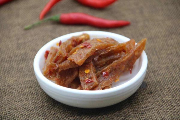 干魔芋以辣著称,是以魔芋为主材料制作而成的一种开胃小吃,在张家界颇受欢迎,也是无数旅游者常挂在嘴边的美食。干魔芋吃起来口感富有嚼劲,符合了张家界人喜辣的特点。