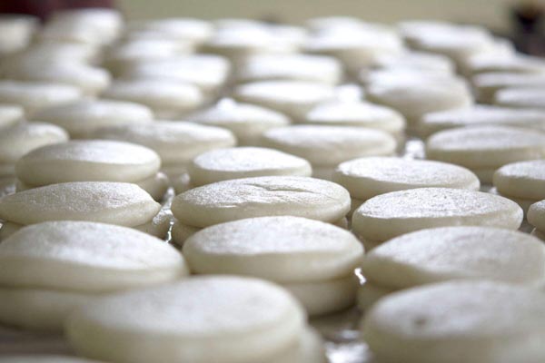 糯米洗净蒸熟;茶油中放入黄色的蜂蜡,加热融化,涂抹在桌面、门板、石臼、木槌等用具的表面;把糯米放进石臼中,用丁字型的大木槌用力捶捣。糯米粘性很强,一般是两个强壮的男人来,一上一下地“打”;糯米捣成泥以后,铺点面粉在桌子上,乘热揪出拳头大的米团,压扁成饼,再用门板加重物压住,等糯米凉了就成型了。