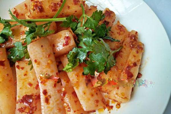 湘西酸萝卜是张家界的一大特色,也是整个湖南湘西地区的特色小吃。湘西酸萝卜往往采用传统土家制作工艺以及独特的油辣子佐料,使得成品颜色极鲜,汁水饱满。吃起来香脆可口、甜中带麻,还伴随着响耳的“嘎嘣嘎嘣”响。